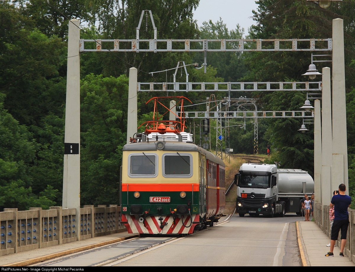 Historical (prototype) Czech electric loco spotted on big old bridge in Bechyne, Czech republic. Very interesting place where trains share half of the bridge with cars.