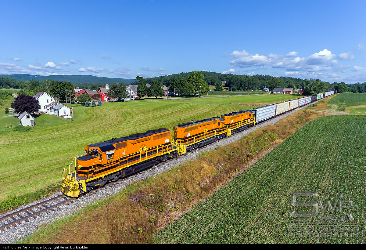 | New England Central Railroad SD40-2 3405 leads SD40M-2s 3474 and 3475 with southbound freight 611-26 turn through the rural southern Vermont town of Vernon with the orange trio contrasting nicely against the hay and corn fields in early growth. |