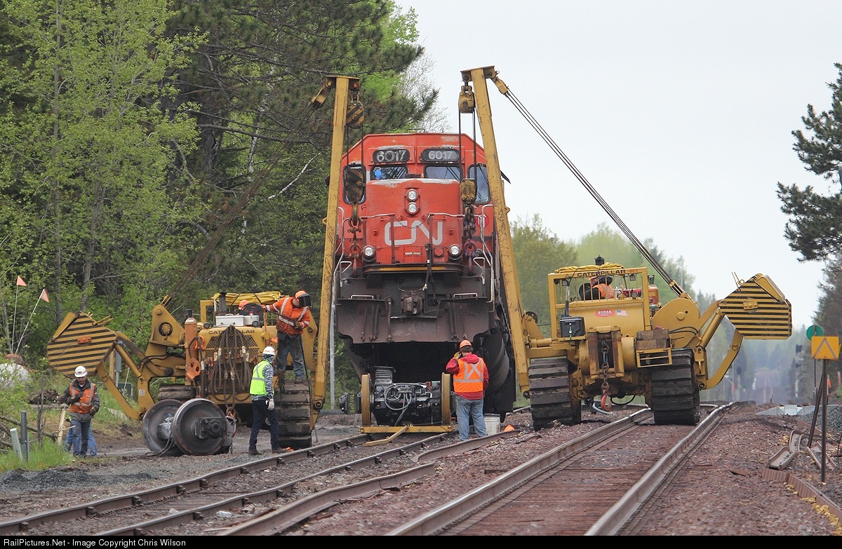 CN SD40u 6017 is lifted in the air at Fairbanks for a field traction motor change out.