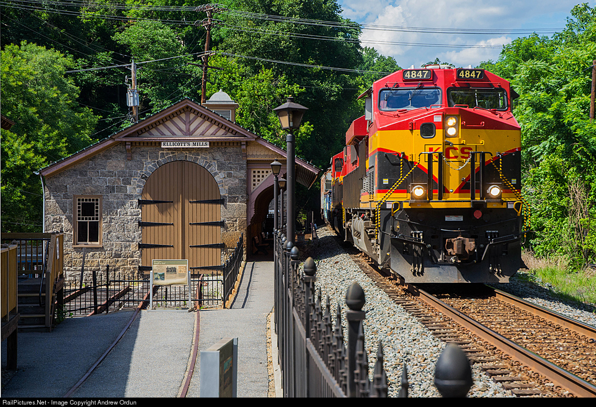 Chicago to Selkirk mixed freight Q388-25, with a pair of KCS Southern Belles for power, is east on the Old Main Line Sub, passing the restored B&O passenger depot, at Ellicott City, MD.