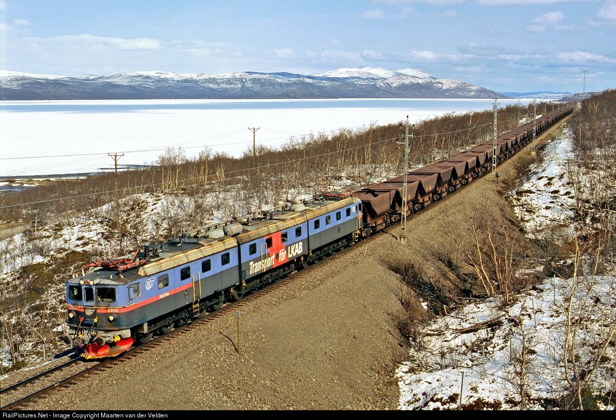 Although it was already may, lake TornetrÀsk was still completely frozen and reminants of the snow were lying alongside the track. Articulated locomotive MTAB Dm 1215 / Dm3 1245 / Dm 1216 "Josefina" with ore train 9916 from Kiruna MalmbangÄrden to Narvik