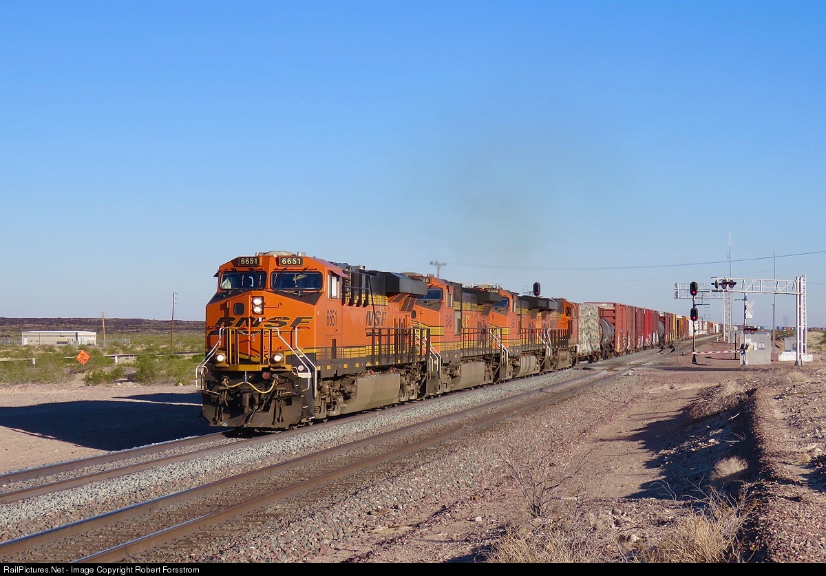 | BNSF 6651 East, H-BARTEA1-26L crossing National Trails Highway 'Route 66' at East Pisgah, CA. |