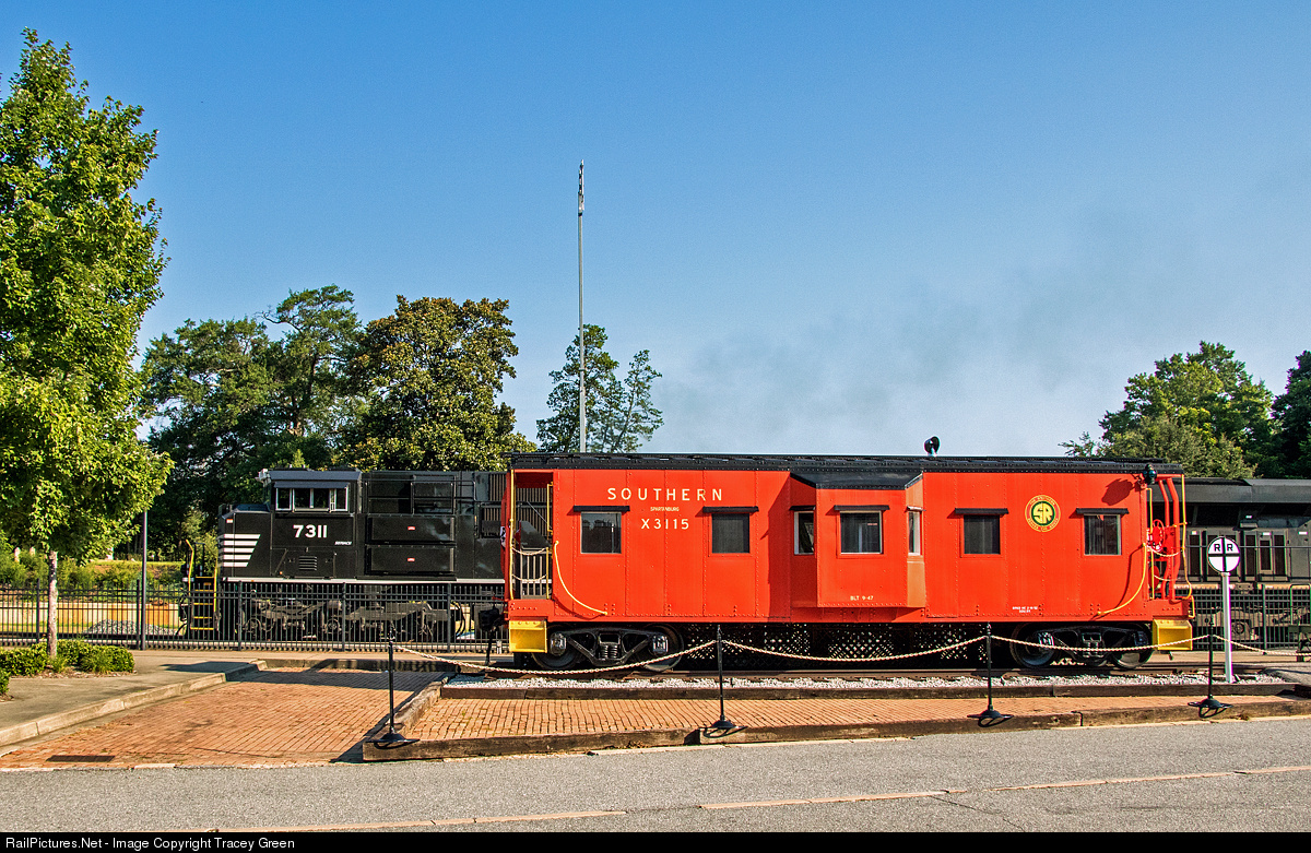 Old and the New. Shiny new rebuilt power leads an intermodal train past a historic caboose built and owned by the Southern and now part of the Hub City Railroad Museum in Spartanburg, SC. This caboose reportedly was made in the Hayne Car Shops in Spartanburg in 1947 out of an old box car, spent much of its life in and around Nashville, TN, then was restored for display at its current location.