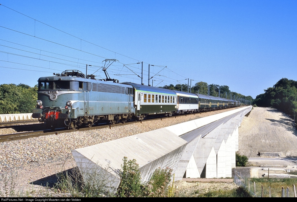 | SNCF BB 16011 passes with R 241 from Paris-Nord to Brest Central the Viaduc de Comelles. In the train four SZD-carriages with destination Moscow. On the right the foundations of the old viaduct.