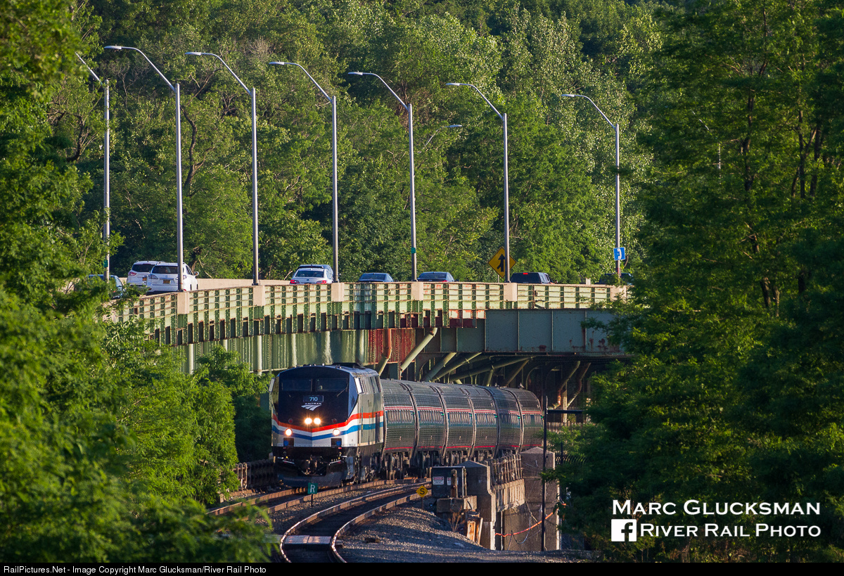 | The Amtrak 241 is just about to leave New York, New York on 6/9/2017 as it heads north on the Empire Corridor with 710 (P32AC-DM, Phase III) leading at about 1930. This is one of those "summer only shots" - if you come here in months with shorter days you will find yourself in total darkness. |