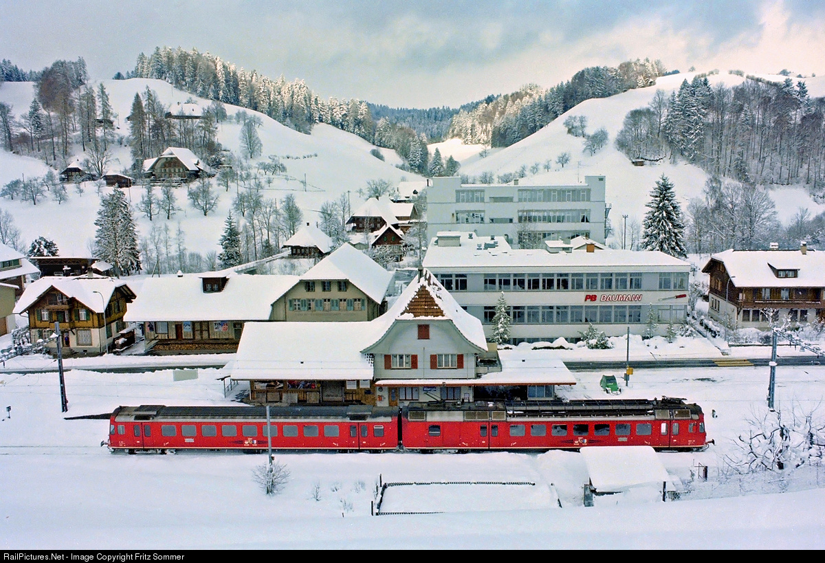 | 31 years ago: Snowfall has enchanted the landscape and a shuttle train is waiting at the final station Wasen i.E. for his return to Sumiswald-Ramsei. Eight years later in 1994, the passenger traffic to Wasen i.E. was discontinued. |