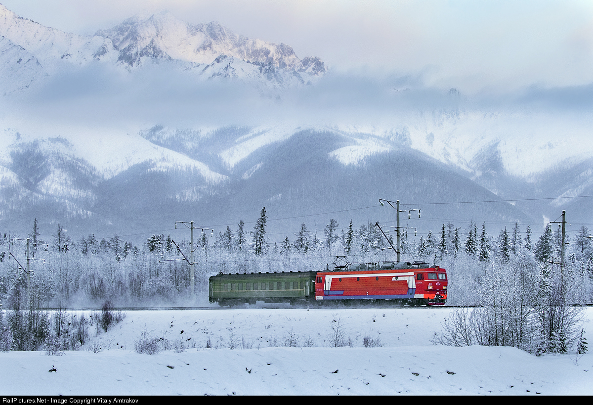 EP1-341 leads train for railway workers near Novy Uoyan station (The Baikal–Amur Mainline). Temperature is minus 17 degrees Celsius