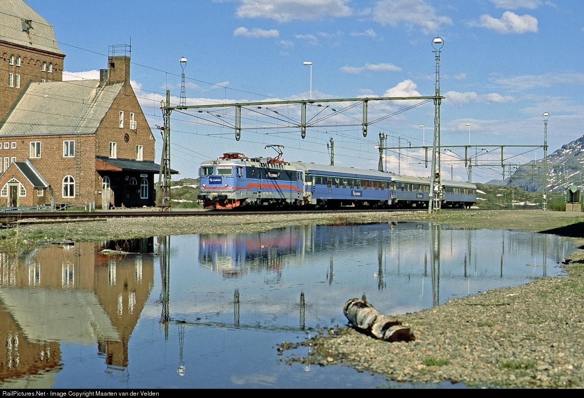| Connex Sverige AB performed the passenger services in northern Sweden from 2004 untill 2008. The stock was rented from a SJ AB owned leasing company. On the photo train 96 from LuleƄ C to Narvik during the stop at Vassijaure station. The locomotive and the tailway station mirroring themselves in a pond of meltwater.