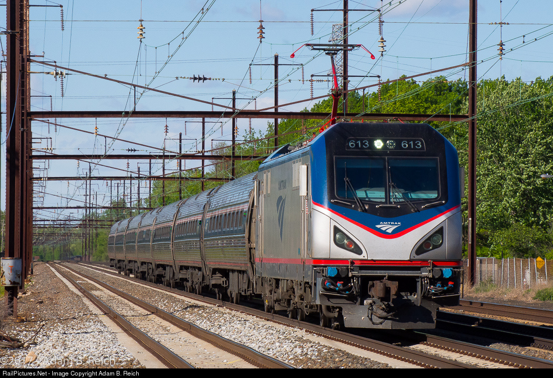 | Northeast Regional Train 127, led by ACS-64 #613, approaches SEPTA's Levittown Station on Track 3 on May 15, 2017. |
