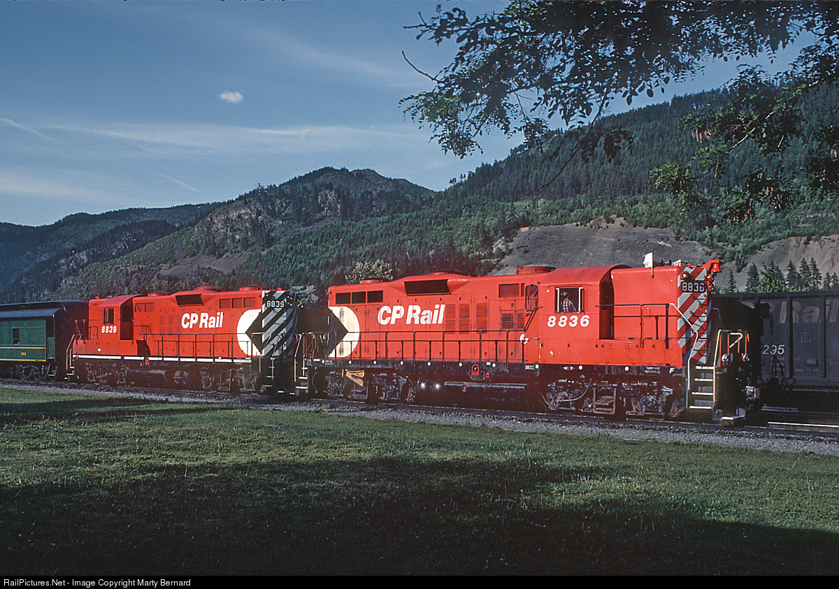 The Okanagan Express ran annually in the mid to late 1980s from Vancouver to the Okanagan Valley Wine Region in British Columbia. A Roger Puta Photograph After I posted this I received this note from thf9. "I grew up in North Bend BC on the CPR main line and I can tell you with out a doubt this photo was taken in North Bend yard with the OK Express west bound on the main line (true direction is south as the Fraser Canyon runs north and south at North Bend) Styoma Creek is in the back ground behind the bluffs and the cut bank in the back ground over the cab of 8836 is the Trans Canada Hwy #1 just north of Boston Bar BC. The fore ground is part of the lawns of the old hotel and restaurant 'Fraser Canyon House' These grounds, flower beds, and lawns were awarded the honor of the best kept on the whole CPR system for a number of years!"