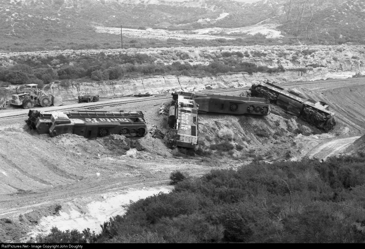 Oops, the derailment just north of Highway 138 in Cajon Pass. Heavy rains cause track damage in the area, requiring work crews to repair the track. As crews were working in the early morning hours, Santa Fe 3279 East came around the corner and apparently hit a front-end loader at 5:10 am, causing the derailment. You can see the front-end loader to the left. The train was traveling at 23 mph, there was one injury, thankfully no fatalities. Derailed locomotives are ATSF 3279, ATSF 2959, ATSF 3282, and ATSF 3338.