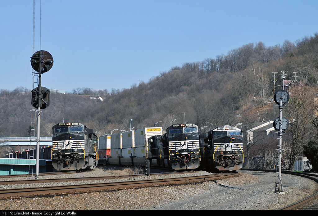 Train time at Wilmerding!! Doublestacks, NS 21G, roll westbound on track 1 (center) while empty hoppers (NS 591) wait on track 2 (left) to follow 21G over the Port Perry Branch and onto the Mon Line. To the right, additional empty hoppers (NS 535) wait on track 99 for a recrew.