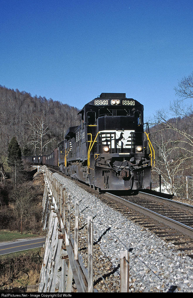 A loaded Yuma Turn, NS 607, crosses Bootleg Trestle approaching Natural Tunnel. The dynamics are doing their part to hold 607's speed in check approaching the 15 mph speed restriction through Natural Tunnel.