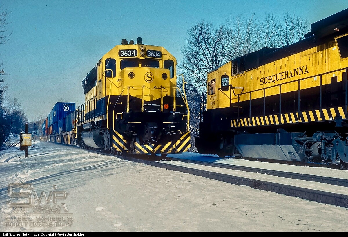 In 1989, New York Susquehanna & Western was in control of the Delaware & Hudson Railroad and was moving intermodal trains between Binghamton and Buffalo, NY over trackage rights on Conrail's Southern Tier. Trains 252 and 259 are meeting at Linden, NY with SD45 3638 on the eastbound 252 and a friendly crew wave from the 4008 leading westbound 259. Scanned from my K25 slide.