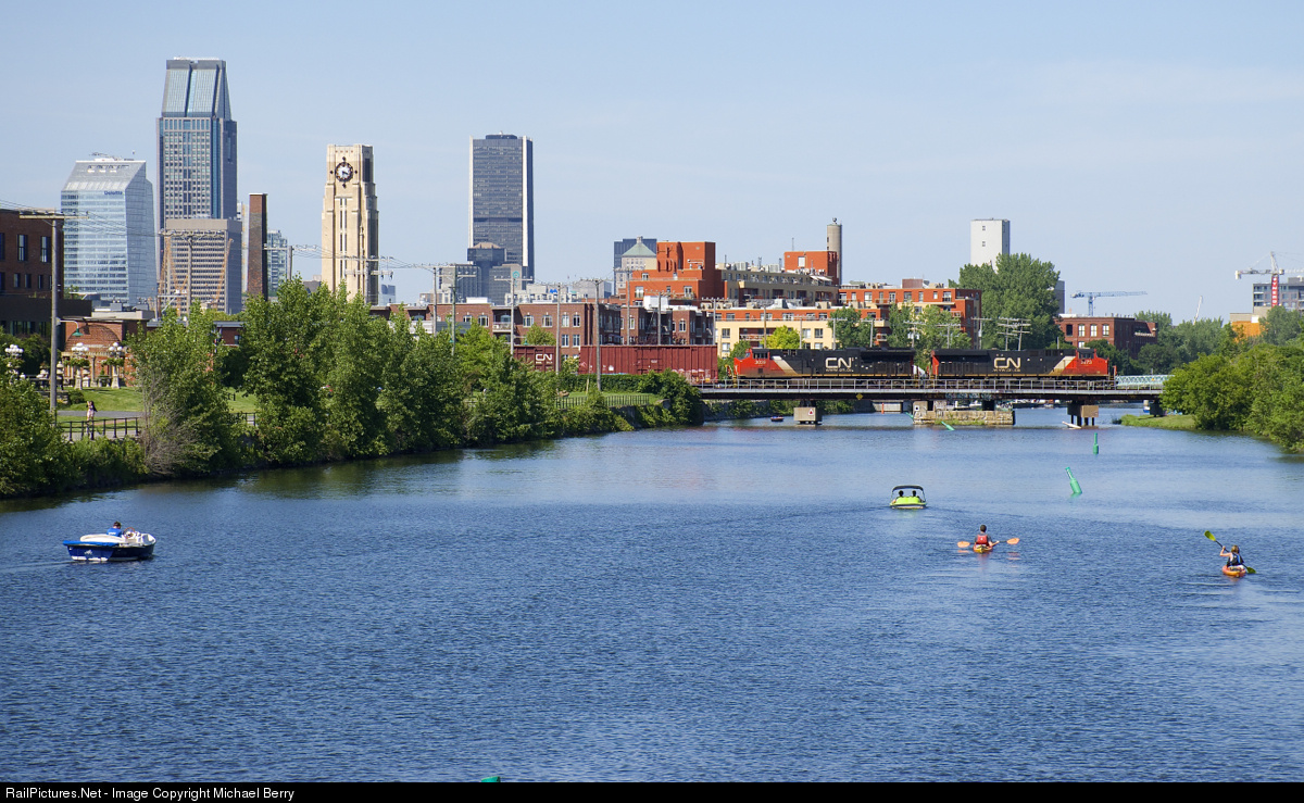 A summer day in Montreal. CN 2873 and CN 3039 lead CN 324 over Lachine Canal on a warm afternoon in Montreal, with the downtown skyline in the background and a number of boaters out on the canal.