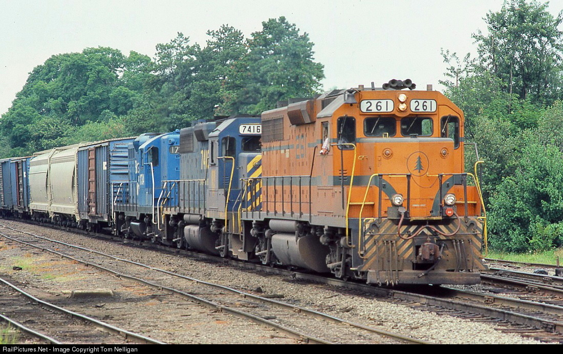 Three units, three railroads: Maine Central GP38 261 teams up with a D&H GP39-2 and a B&M GP9 on B&M/MEC runthrough train MEBA (Mechanicville, NY, to Bangor, ME), seen eastbound at Ayer, MA. Colorful combinations like this were fairly common early in the Guilford era.
