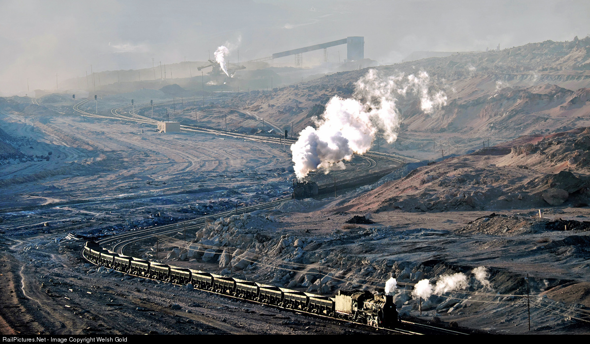 Steam at Sandaoling open cast coal mine in China with three JS Class locos in action. The train in the far background by the loader is taking on coal, meanwhile the train in the foreground is pushing back to the loading bay with a rake of empty coal wagons, whilst another train loaded with coal makes haste in the opposite direction to the wash plant. On a bust day, one could see coal trains every 20 minutes or so.