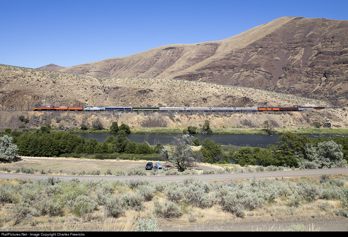 | Oregon Rail Heritage's Daylight Excursion to Bend, OR (operating as Amtrak train 925) runs along the stunning Deschutes River in central Oregon on the Oregon Trail Sub. |