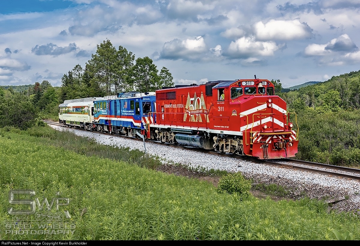 On July 7, the Federal Railroad Administration geometry cars, DOTX 218 and DOTX 220, were operated over Vermont Rail System's Green Mountain Gateway. The westbound train departed Bellows Falls, VT with VTR 50th Anniversary GP40-2W 311 leading the cars westbound for Whitehall, NY. The train is westbound off of the summit and headed for Mt. Holly.