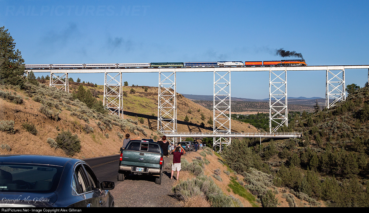 SP 4449 leads the 2017 Cascades Daylight across the towering bridge just west of downtown Madras as it closes in on its final destination of Bend, Oregon.