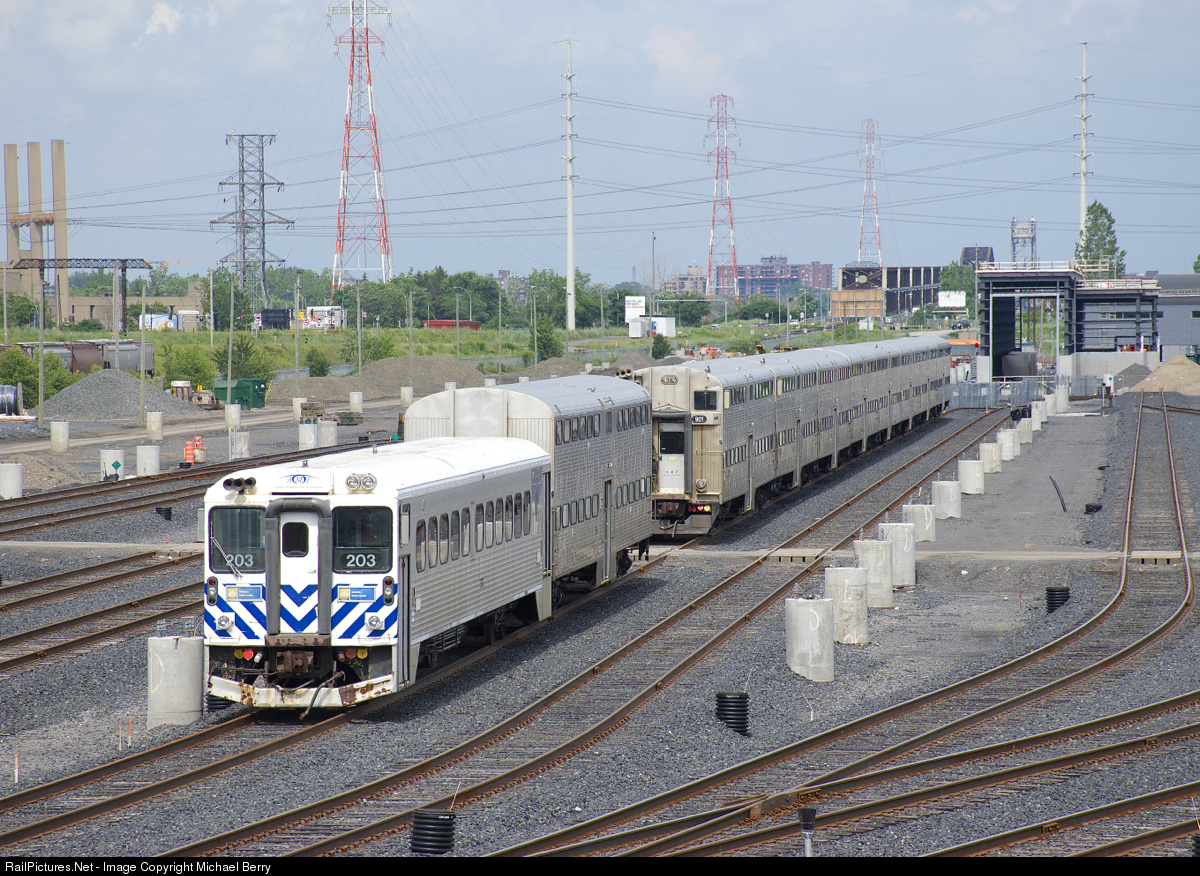 | Out of use. A single AMT 'Go-Kart' (ex-GO Transit single level car built by Hawker Siddeley) and all nine gallery cars that Canadian Vickers built for CP in 1969 as the first bilevel cars in Canada (currently AMT 900-901 & AMT 920-926) are stored at the fairly new Pointe-Saint-Charles Maintenance Centre. All of these cars have been out of use since AMT acquired new Bombardier multilevel cars in 2010. Barely visible in the back at right is the Montreal entrance to the Victoria Bridge. |