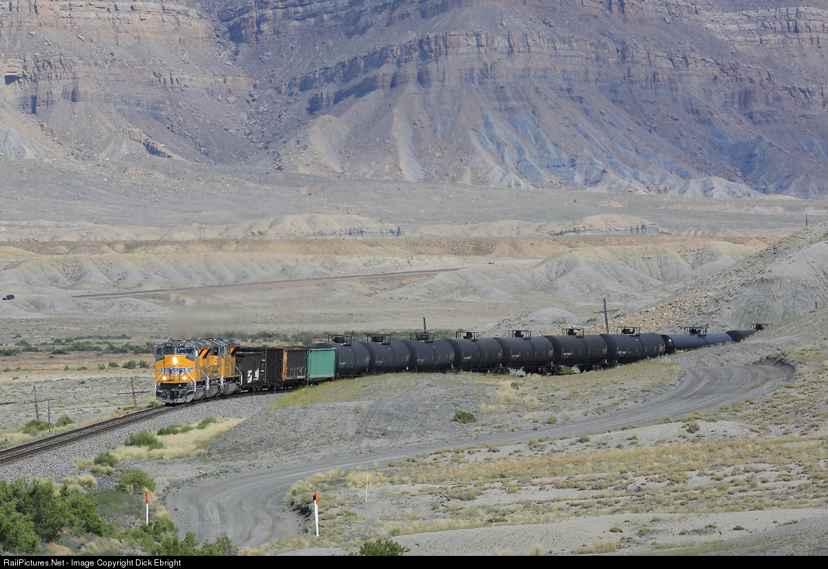 #3027, one of Union Pacific’s brand new SD70Ace-T4’s, is the lead engine on a matched set of 3 T-4’s leading the MNYRO-14 today. The train is seen here near the east switch of Grassy siding, west of Green River, Utah. Those are the formidable Book Cliffs behind the MNYRO and this train has been following them for over 100 miles and still has another 40 miles or so to go before reaching Helper.