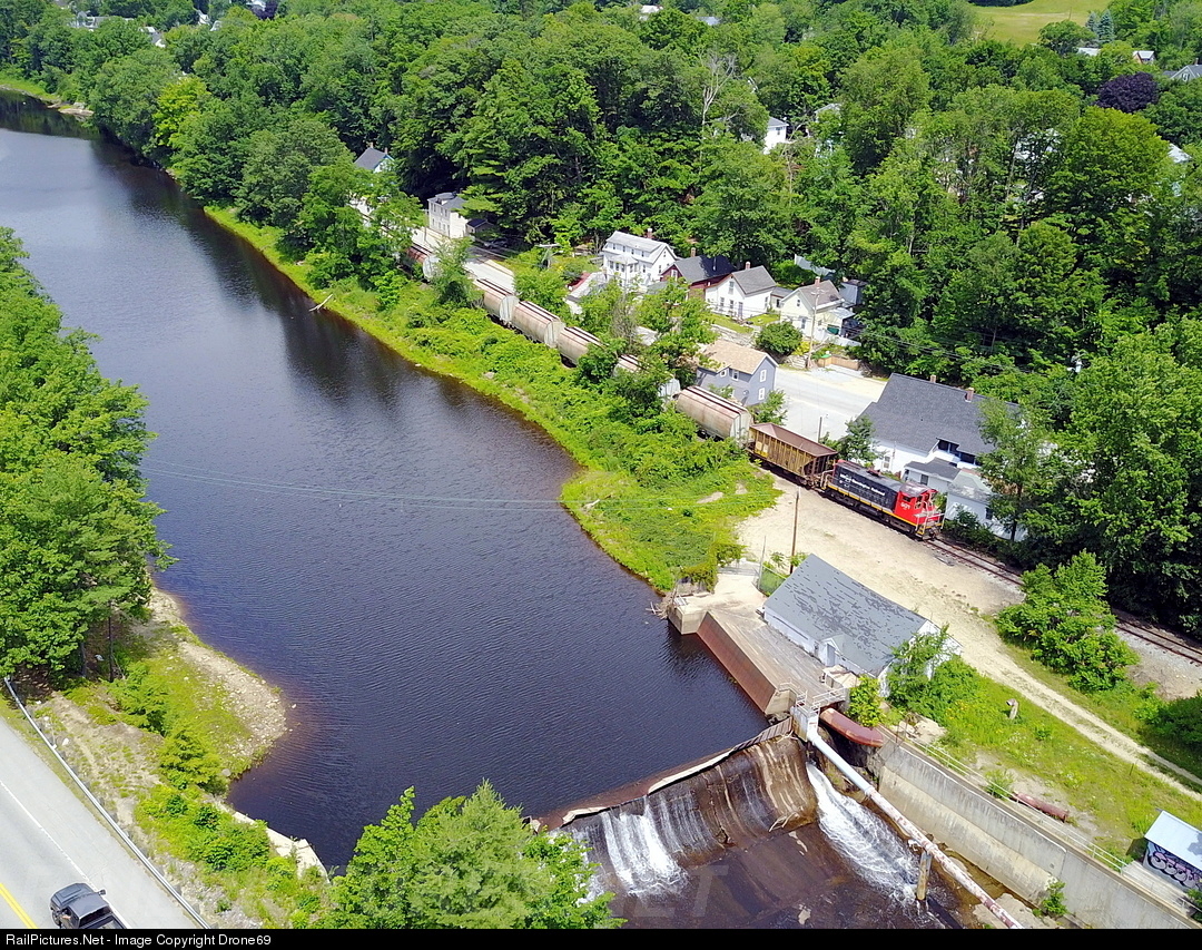 M&B SW9 shoves empties into Wilton along the Hillsborough Mills Dam on the Souhegan River