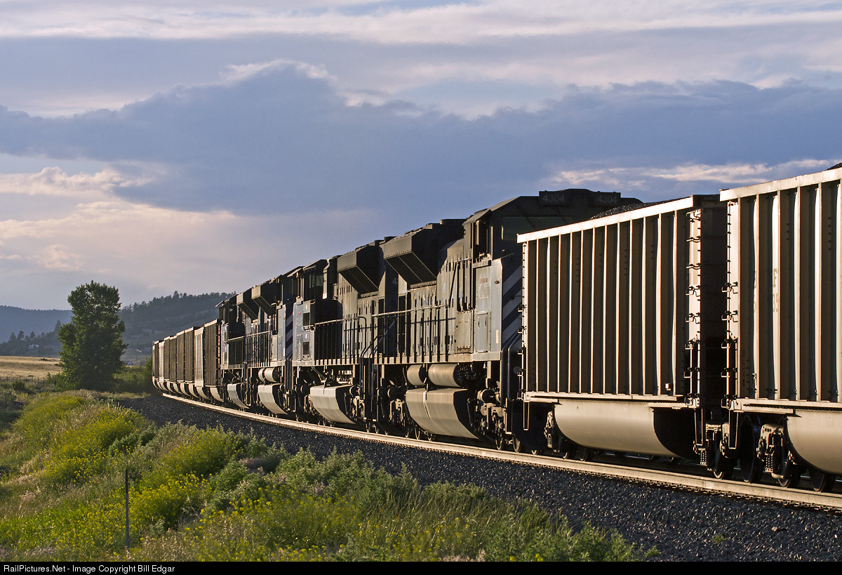 | MRL 4304 brings up the rear of a quartet of helpers tucked into a loaded coal train heading through Birds Eye after leaving Helena, MT. The train will spend the next hour or so climbing Mullan Pass on its way to Missoula and utlimately Roberts Bank, BC. |