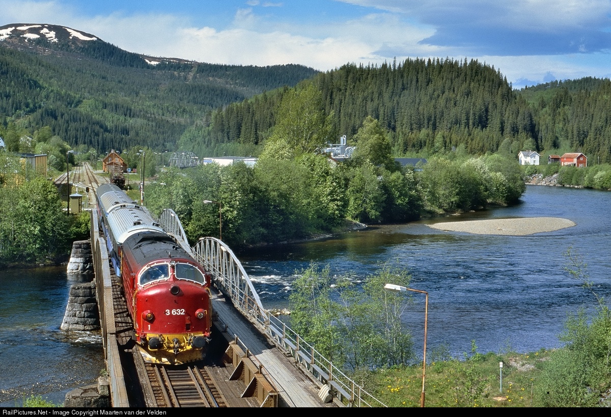 | NSB Di.3.632 with train 385 from Trondheim S to Storlien passes the bridge over the Stjørdalselva. The train composed of two Swedish carriages is riding over the Meråkerbane. At Storlien, the Swedish border station, the carriages are transferred to the train to Stockholm. In the background Gudå station.