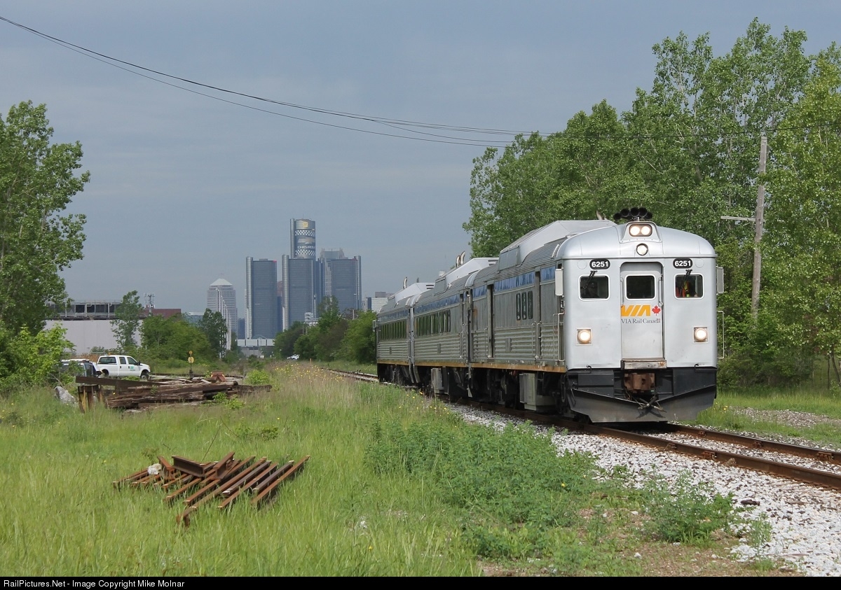| Back in May Windsor hosted the Memorial Cup which our Spitfires ended up winning. During the tournament VIA took school students to and from the WFCU Center while giving them lessons on rail safety. This was the first time since the 1980s that VIA RDCs were in Windsor. This was one of the first runs for the week they were down here and the weather wasn't very cooperative. In the background you can see the ominous sky over the Detroit skyline. |