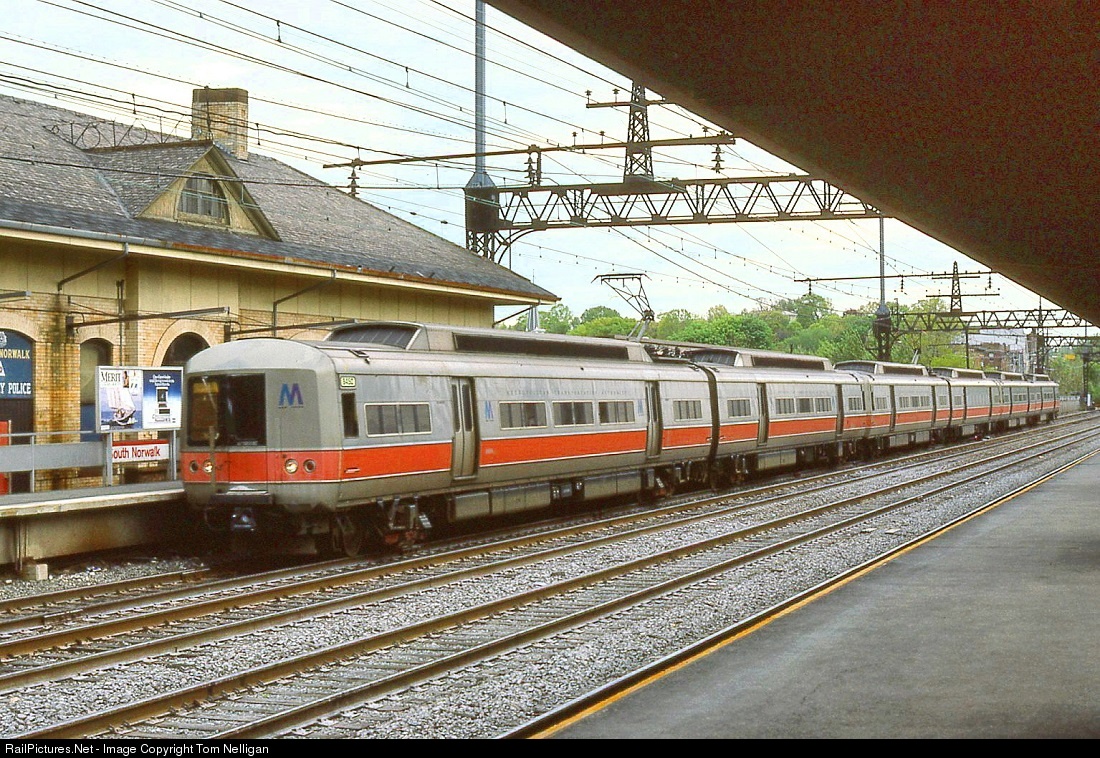 | A six-car set of Metro North M-2 class MUs that includes one of the fondly remembered New Haven Line bar cars pulls into the station at South Norwalk, CT, on an evening commuter run from Grand Central Terminal. The station on the eastbound side here here was built by the New Haven RR in 1895 and is still in use in 2017. |