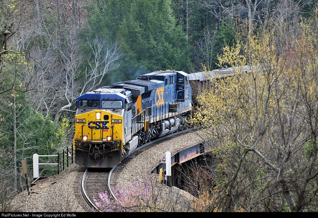 It's early spring in SW Virginia. The redbuds are blossoming; the leaves on many of the trees are starting to come out. CSX 506 leads an empty hopper train across the curved trestle in East Stone Gap. Only a few more miles until the train regains CSX rails for the remainder of the return trip to the eastern Kentucky coal fields.