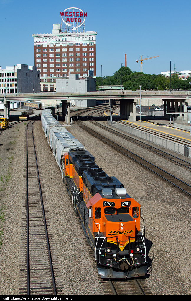 | BNSF 2761, a former Southern Railway GP30, sprints past the Western Auto building with a local bound for Argentine Yard. |