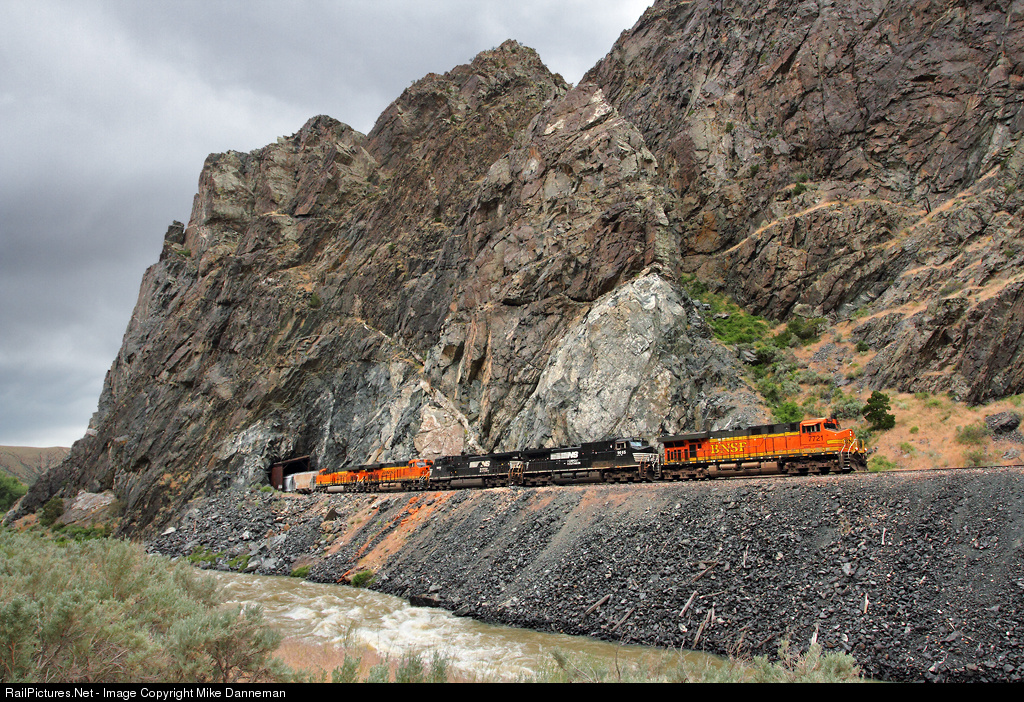 A northbound BNSF freight emerges from 370-foot Black Tunnel south of Dornick in Wyoming’s rugged and scenic Wind River Canyon on June 20, 2017.