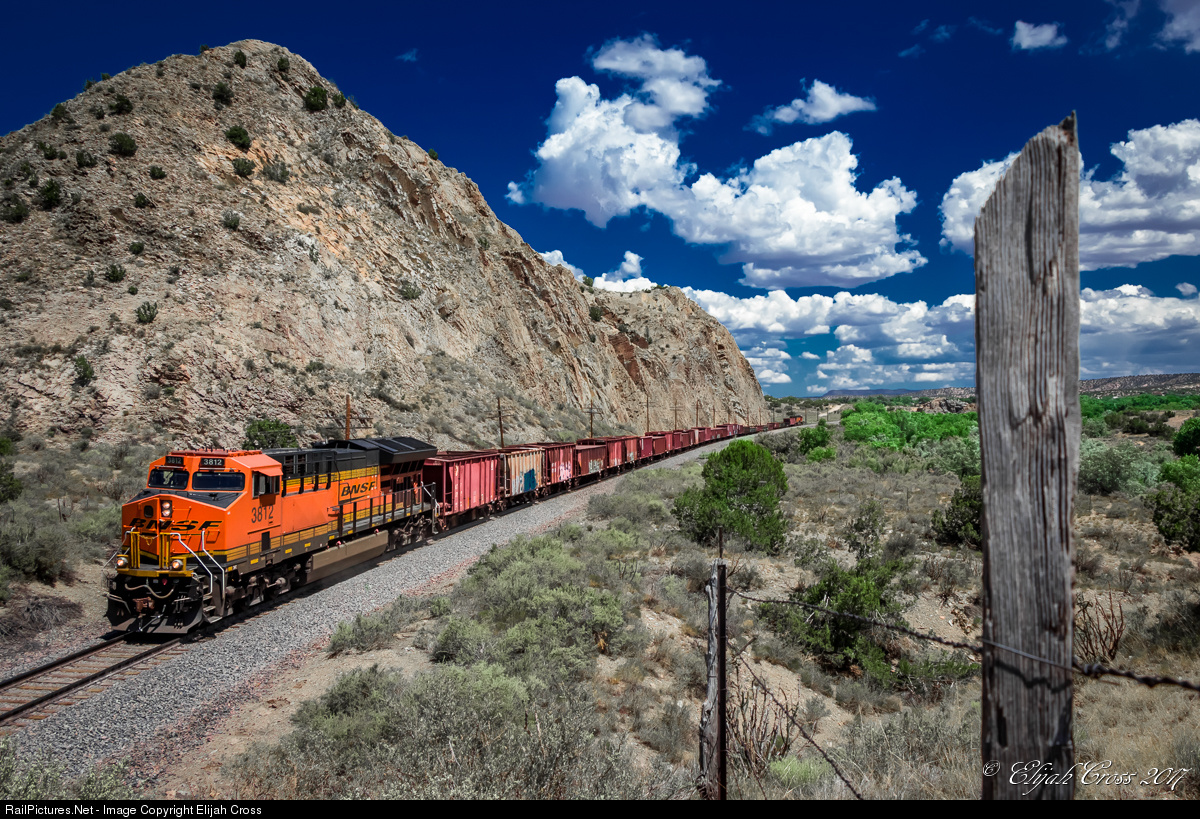 It's a beautifully picturesque summer afternoon and here we see BNSF #3812 as it leads a 30 car tonnage train beneath the "Devil's Throne" in Cerrillos, NM. Due to current track maintenance between CP Madrid and Lamy, NM this 7.5 mile stretch of track has had a 10mph restriction in effect. On this day, this train's sole purpose was to run back and forth ultimately bringing the track back up to its full 79mph potential. Having taken all day, this led to numerous photo opportunities of an otherwise incredibly rare sight.