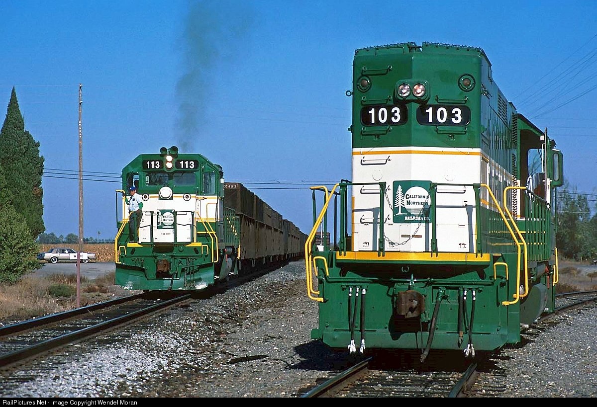 California Northern is positioning a locomotive to lead the beet train's eastward move on the Hamilton City branch. This train of beets from the Klamath Basin will be processed at Holly Sugar's Hamilton City refinery. It was the final year of service for the ancient wood beet racks.
