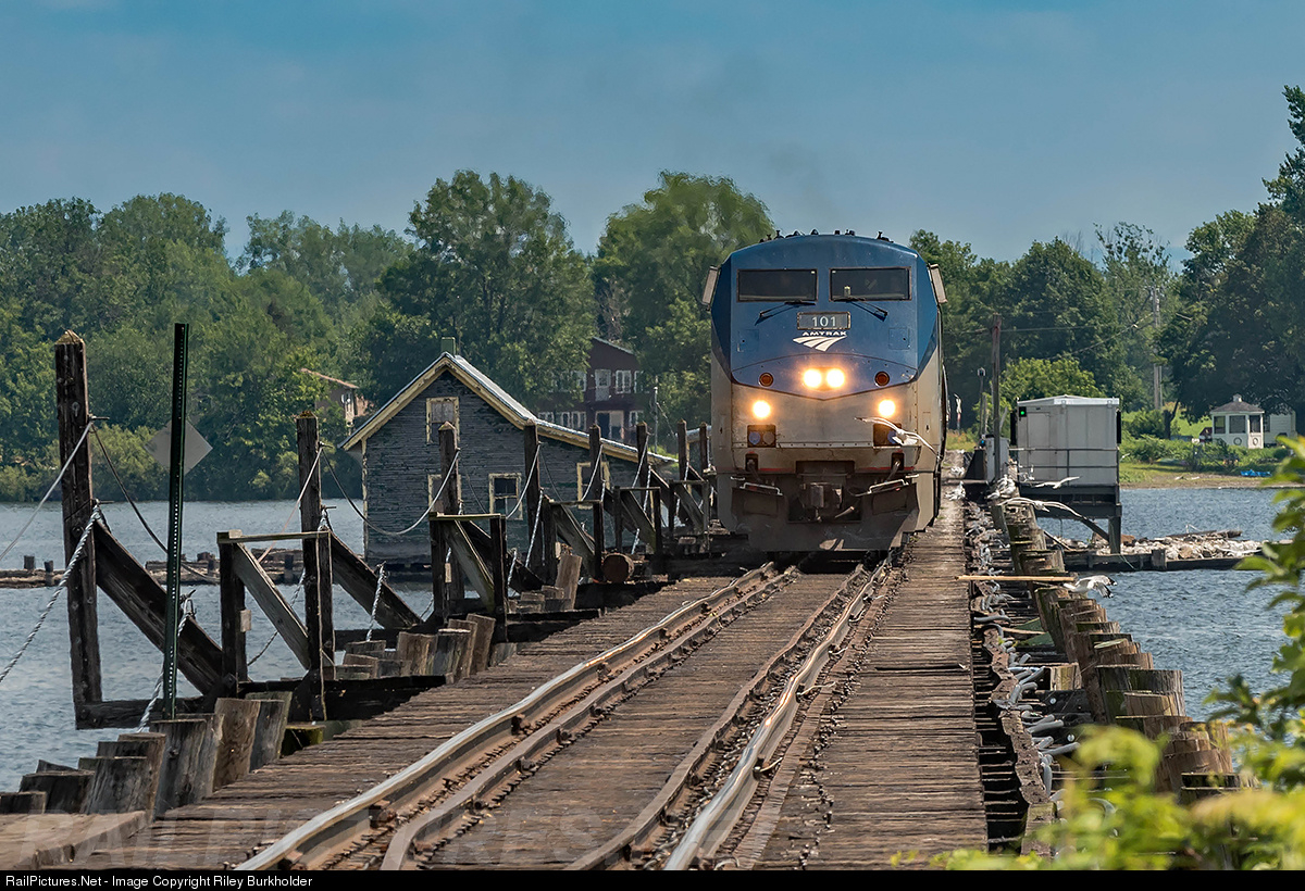 Along with my dad to photograph the Amtrak special on July 18 that ran from St. Albans, VT to Montreal, Quebec on the New England Central and CN Swanton Subdivision, a line normally just served by freight. Using the big lens, the train is seen head on as it crosses the Alburgh Trestle in East Alburgh, VT.