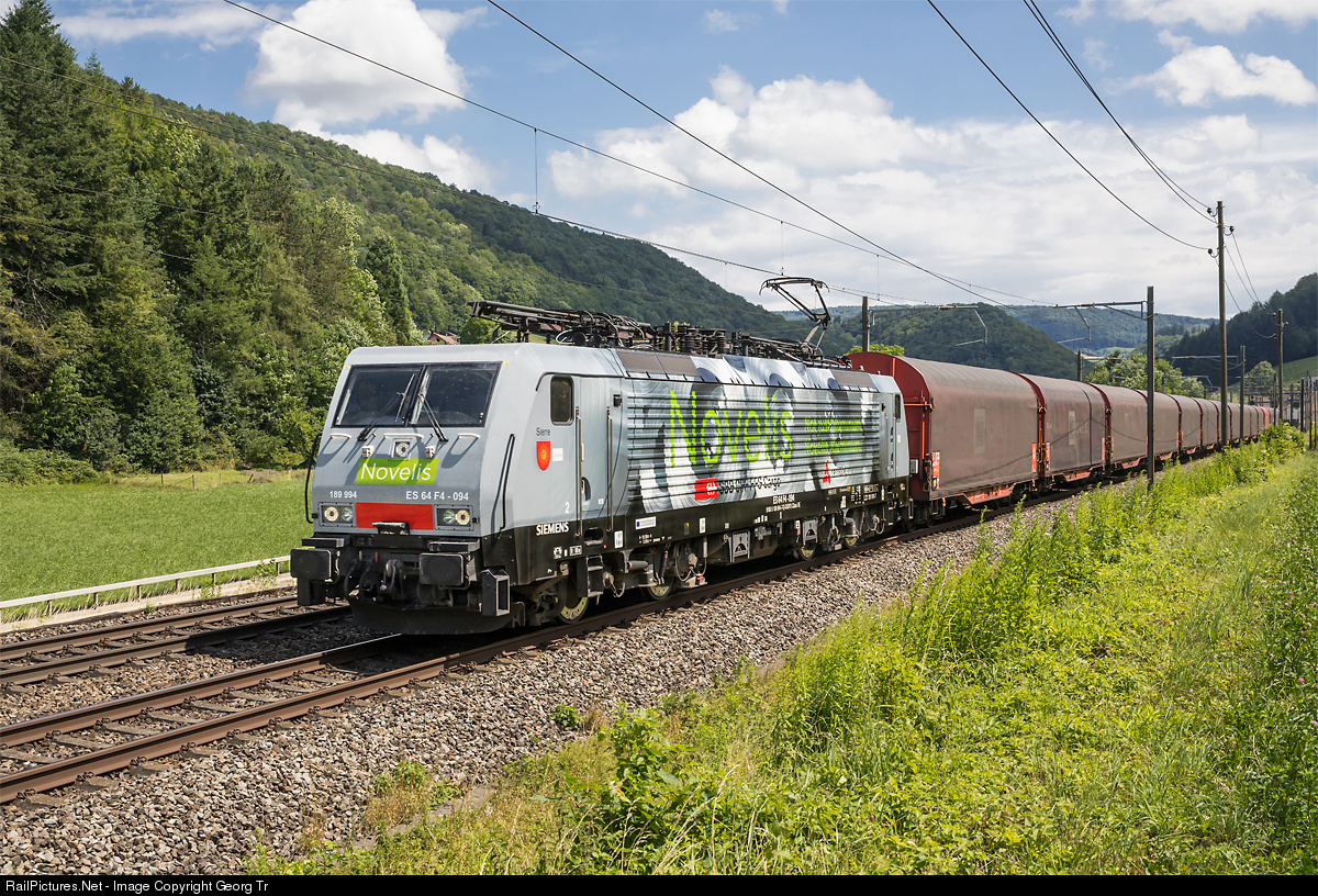 | Siemens ES 64 F4-094 (or 189 # 994) "Sierre" of Mitsui Rail Capitel Europe BV was built in 2003. Since a few weeks rented to SBB Cargo and with a new "Novelis" paint scheme (adhesives), the locomotive is pulling the train 68740 / 48620 of the Novelis aluminum company from the Sierre (Chippis) production work via Lausanne-Olten-Basel to Göttingen/Germany. On the side of the locomotive, aluminium coils are pictured, the same product is transported in the special Shimmns type freight cars. |