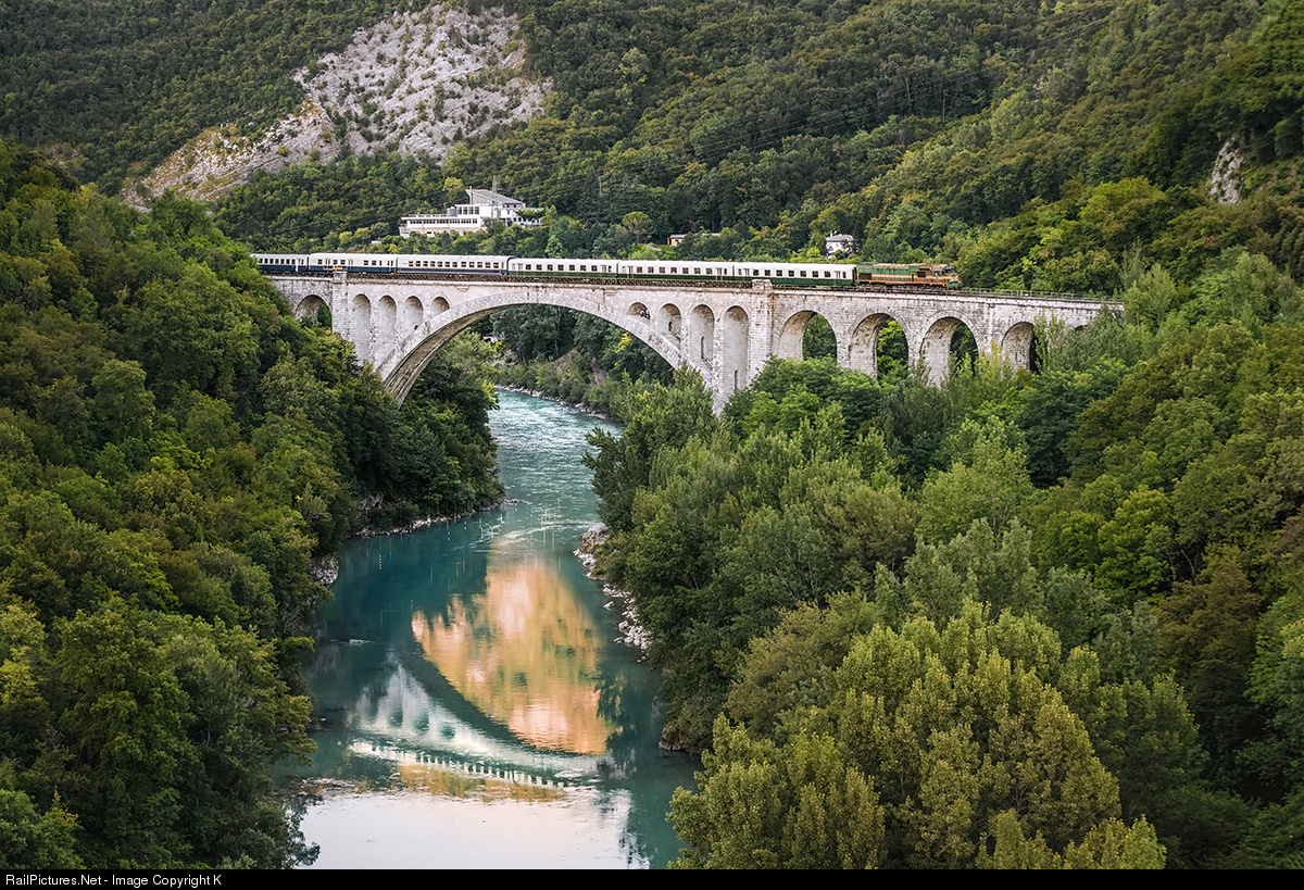 | Isonzó express crosses over Isonzó river (Soca in slovenian). It'd come to the commemoration of the anniversary of battles of Isonzó in WW I. These battles are remembered as one of the worst as more than a million Italian and half a million Austro-Hungarian soldiers died or were missed. On the photo: the Solkan bridge, biggest in its class: single-arched stone bride, 222m long, 36m over Isonzó river, shaped as an S. |