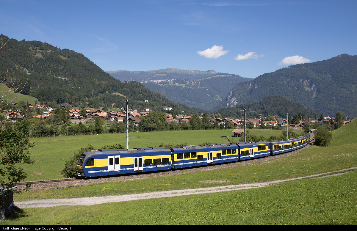 Brand new articulated lowfloor cogwheel train from Stadler Rail for the Berner Oberland- Bahn (BOB), ABDeh 8/8 # 325. The BOB gets six of this new trains. # 325 is coupled with an articulated lowfloor cab car ABt # 421, forming the train from Interlaken Ost to Lauterbrunnen. Coupled with this train till Zweilütschinen is the train to Grindelwald with railcar ABeh 4/4 II 312 leading, so there is a very long consist here (12 cars).