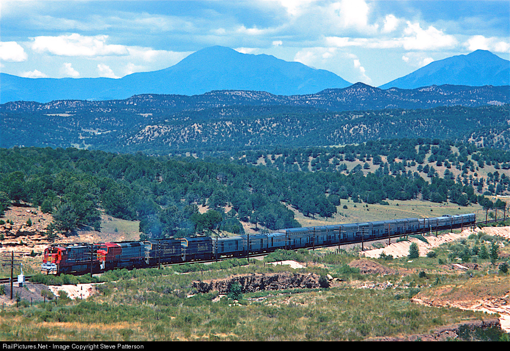 A GE U-28-CG, an FP-45 and two F-45’s tow the 19 cars of Santa Fe’s combined El Capitan / Super Chief Trn. 17 up Raton Pass near Starkville, Colo. on August 1, 1970. The first car is a steam generator.