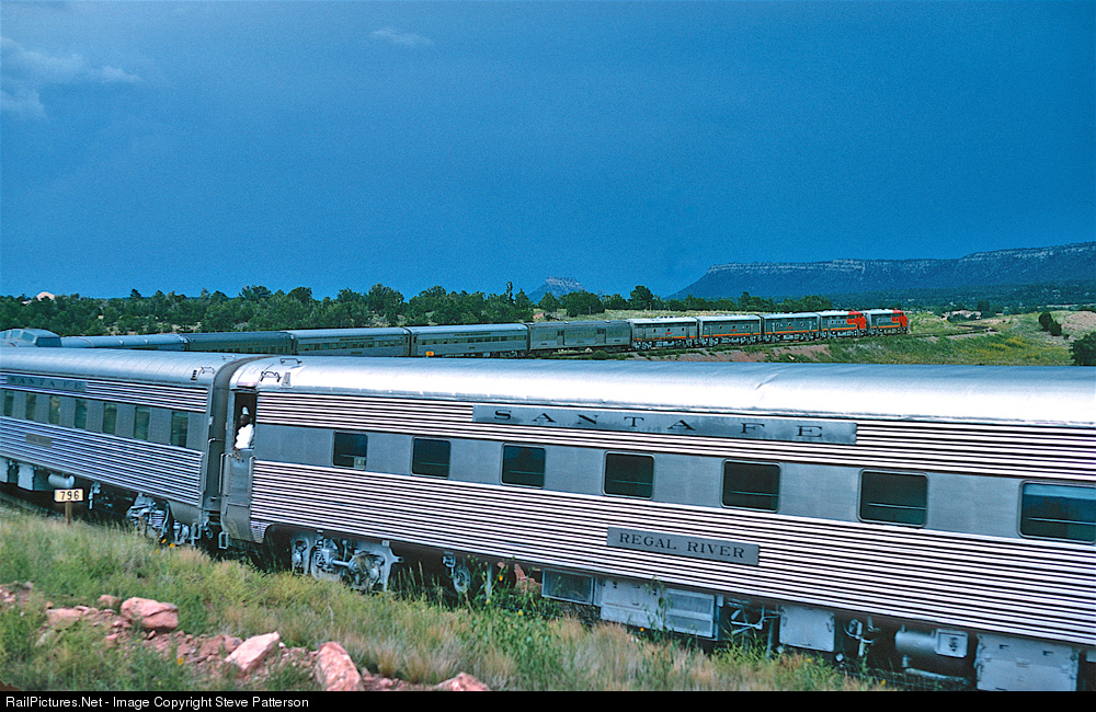 Santa Fe’s all-Pullman Super Chief winds around the horseshoe curve at Blanchard, N.M. en route to its climb over Raton Pass to get out of New Mexico and dash on to Chicago. Five F units were leading it on Aug. 15, 1968.