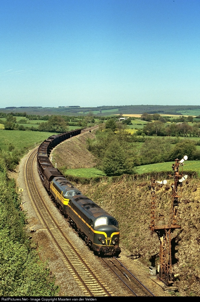 | NMBS/SNCB 5319 and 5202 with iron ore train 48911 from Antwerpen to Athus pass the entrance semaphores of Vonêche.