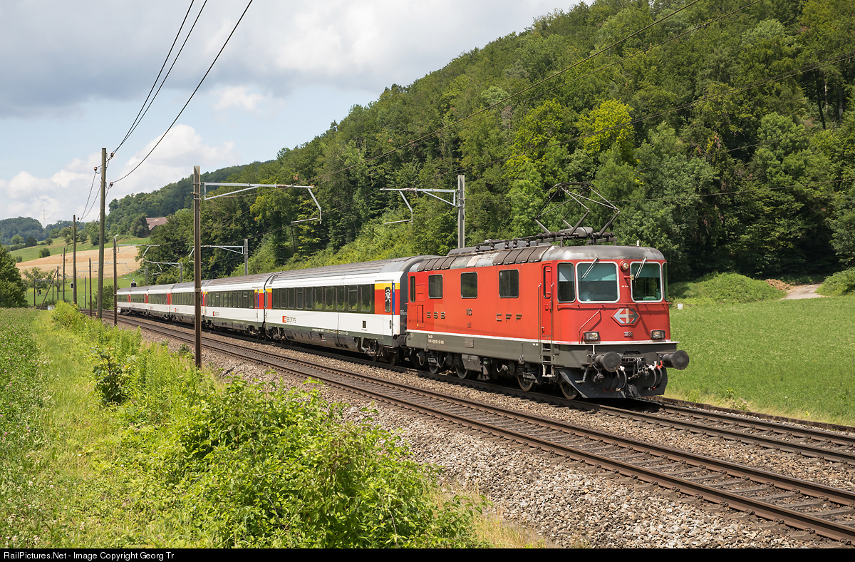 | Re 4/4 II # 11133 from the first series, with the SBB signet on the front (former Swiss Express paint scheme), is pulling the nonstop Intercity 775 from Basel to Zürich over the Hauenstein line. |