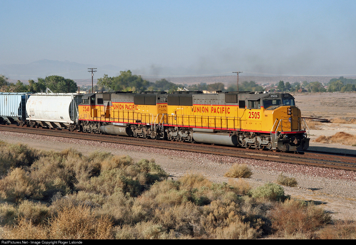 | Union Pacific SD60M 2505 (nee 6350) and 2348 (nee 6190) E/B at Helendale, California. |