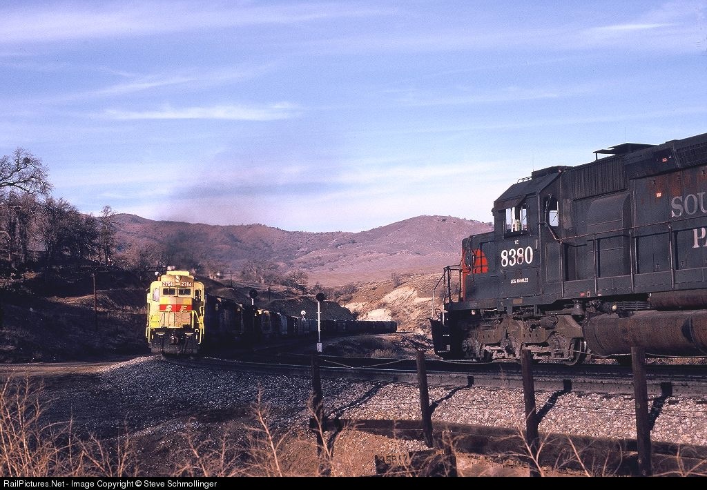 While an SP helper set waits on No. 1 track at Cable Crossover, Santa Fe 2714 East roars up No. 2 main.