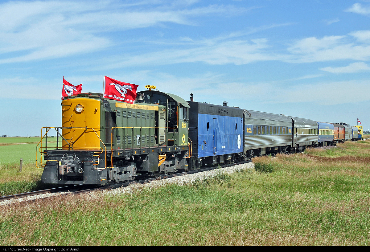 Lead by ex Parrish & Heimbecker MLW S-3 the Aspen Crossing Railways Saturday afternoon Ales on Rails excursion has just reversed at the end of the line and is heading back towards Mossleigh. The consist comprises Generator Car 15475, ex CN, ex VIA, Ex Nagel Tours; Tavern/Lounge ex NYC; Diner "Farrow" ex CP; Baggage 105, ex UP; Dome/Lounge "Glenview" ex ATSF; Coach "Queenstown" ex CP; Gondola 422400, ex CP and Caboose 437377 ex CP.