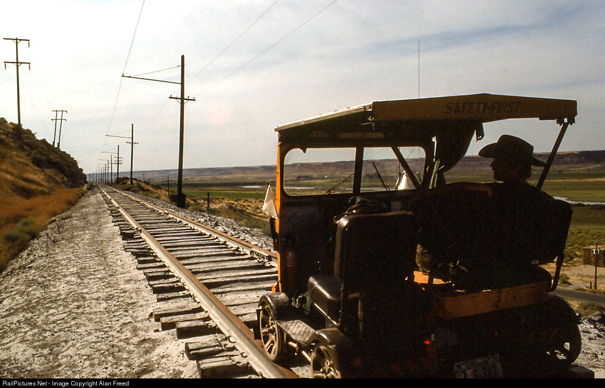 M-19 Fairmont Speeder, east of Beverly, WA--volcanic ash from Mouth St. Helen's 1980 eruption is visible on the tracks. --- In the winter of 1980 The Chicago Milwaukee St Paul and Pacific Railroad (Milwaukee Road) abandoned almost two thousand miles of track west of Miles City Montana. The abandonment of the “Pacific Extension” was the largest single railroad abandonment in American history. In early August 1980, Alan L. Freed and Chuck Bothwell took what may be the final trip on the abandoned Milwaukee Road’s Pacific Extension from Miles City, Montana to Cedar Falls, Washington. They both worked as Locomotive Firemen and Engineers on the Penn Central’s Chesapeake Division in the early and mid 1970’s. A 1952 M-19 Fairmont Speeder was purchased for $400 from a scrap heap at the Maine Central Railroad Yard in Waterville, Maine, specifically to make this trip.  A “new” railroad was formed–The Great Northeastern Pacific South and Western Railroad, affectionately known as the “Weedroute.”