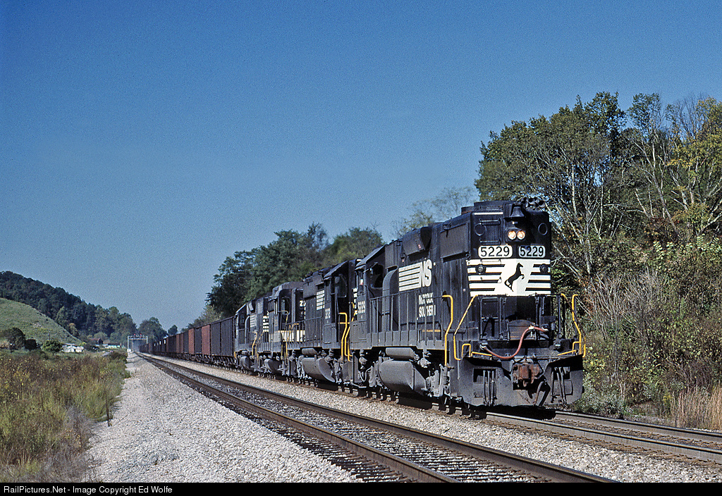 The engineer slows his steeds as he passes CP Watkins and rolls along the main at Daniel Boone, Va. Once the rear pushers clear the Watkins signal in the background, the train will roll to a stop so the pushers can uncouple and make their way back to Andover Yard.