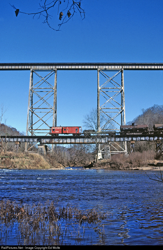 The Clinch River flows by as Copper Creek empties into the Clinch beneath Southern cab X549. The ex-Southern's much lower crossing of Copper Creek is dwarfed by the ex-Clinchfield's much more famous Copper Creek Viaduct. A short Yuma Turn out of Andover Yard didn't require pushers so the rear end was only adorned with a caboose.